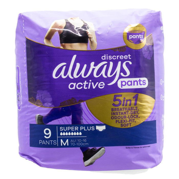 Always Pk9 Pants Discreet 5 In 1 Breathable Instant Dry Odour Lock Flexi Fit Soft Active Super Plus Medium 10-16 70-100cm